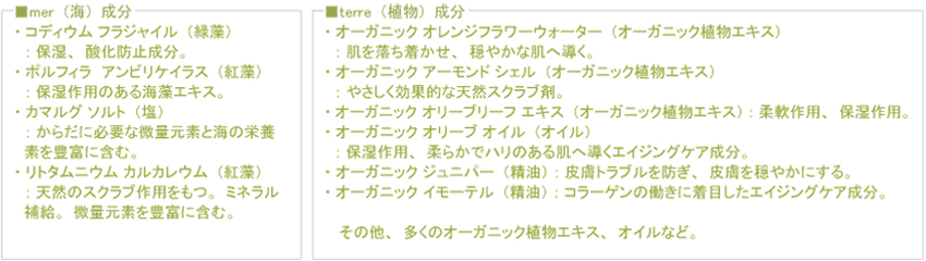 地中海から得られた厳選した海藻成分やエッセンシャルオイルを使用したこだわりの『テレ エ メール』。